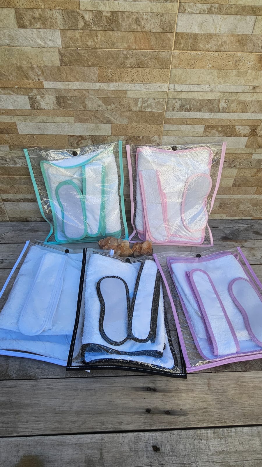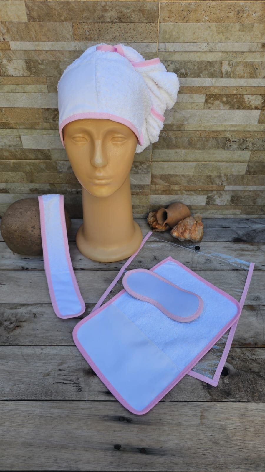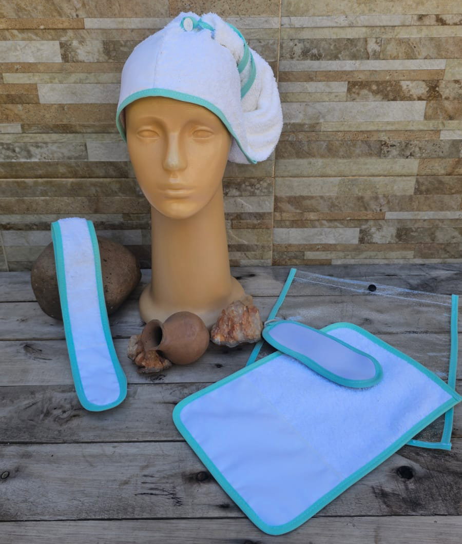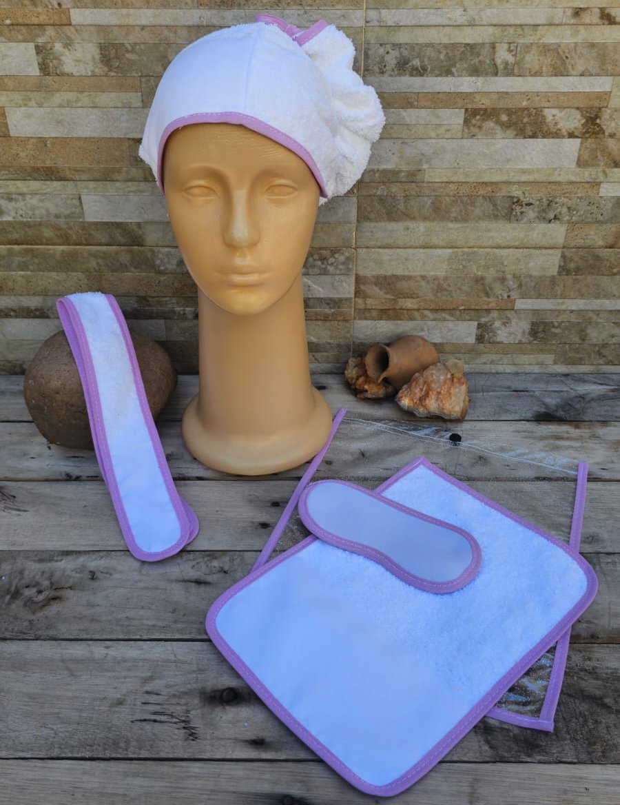 5 Piezas: Turbante + Vincha + Toalla 20x30 + Sobre Cristal Snap + Antifaz de neoprene