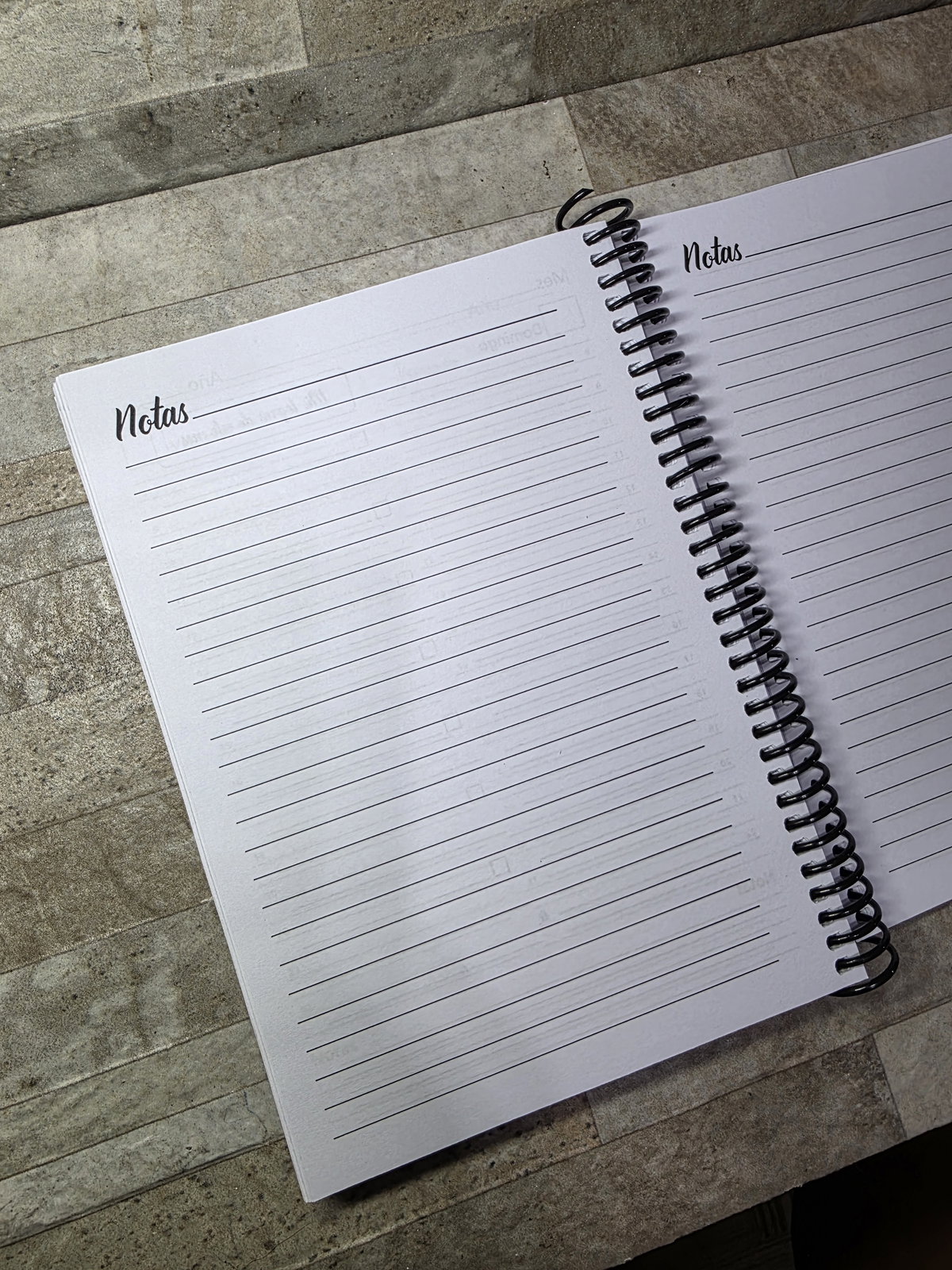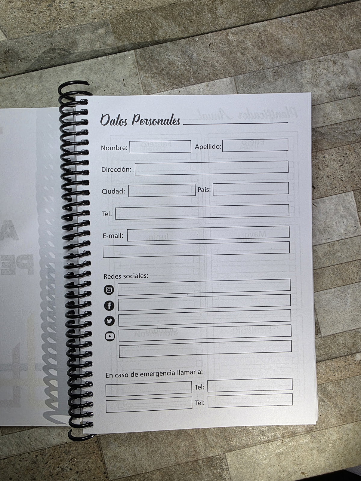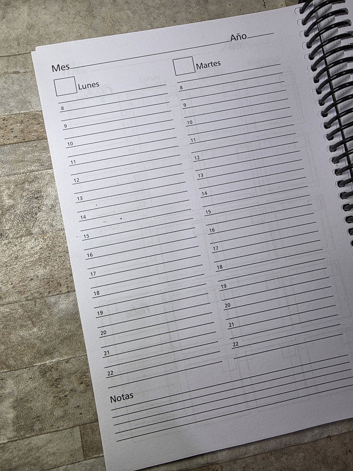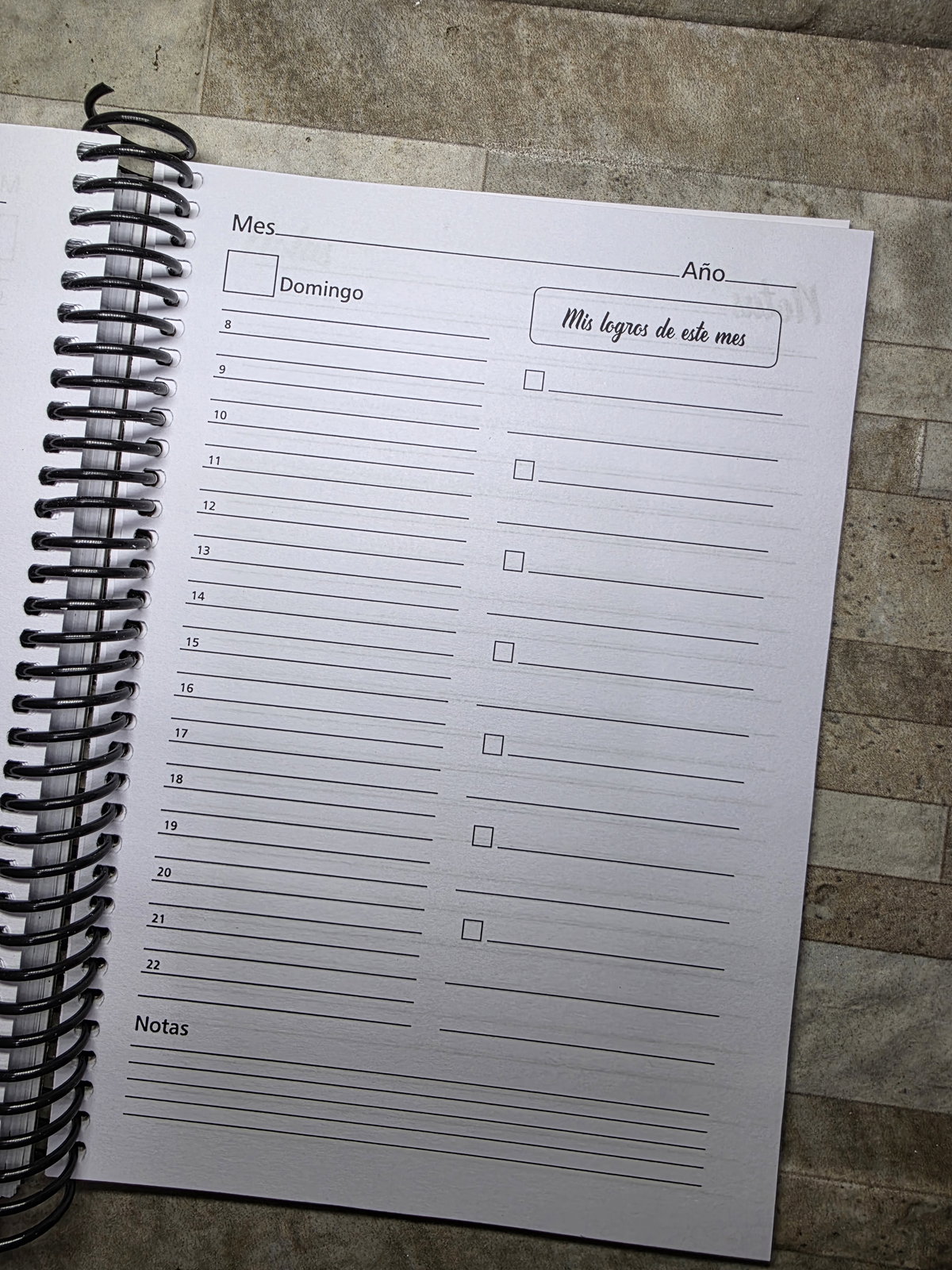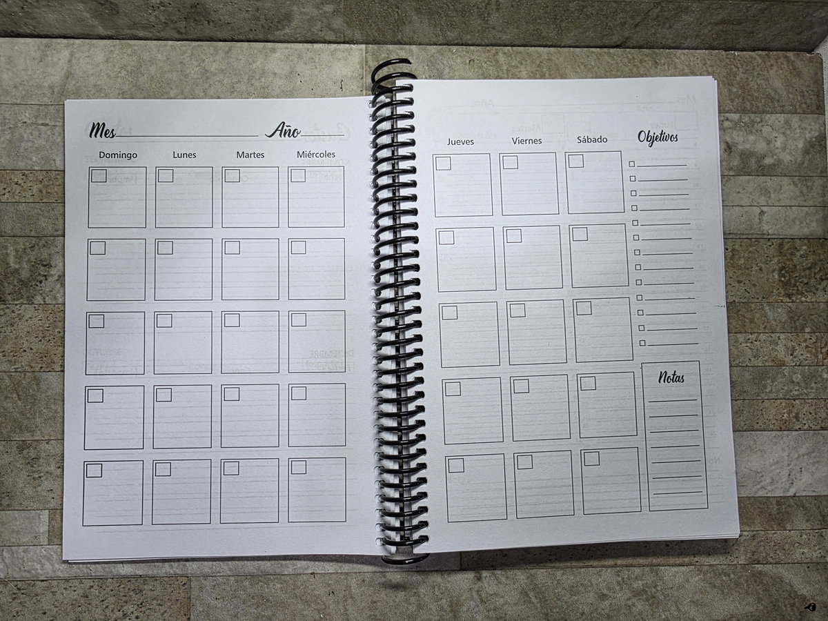 Secciones: Datos Personales, planificador anual, gastos, 2 días por hoja con horario de 8 a 22hs, notas