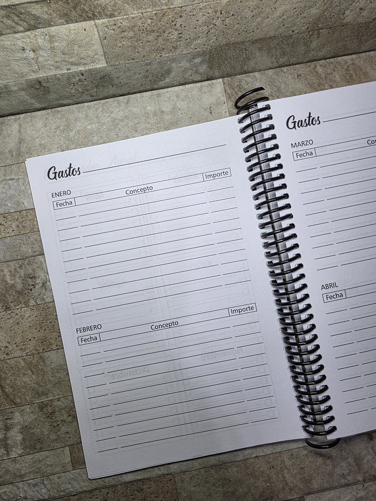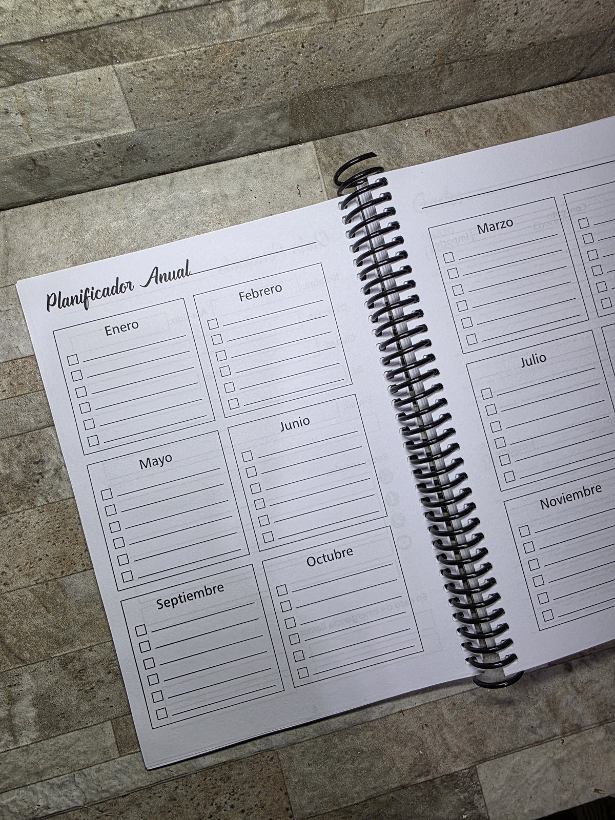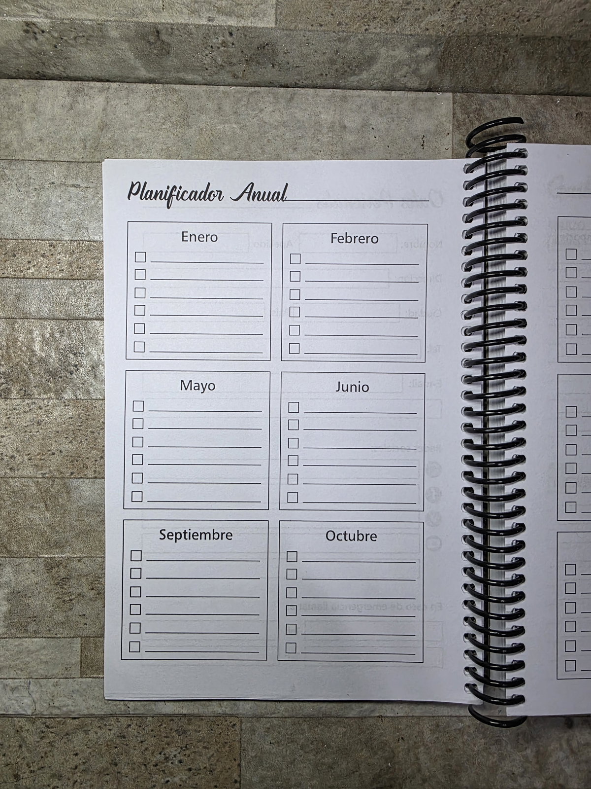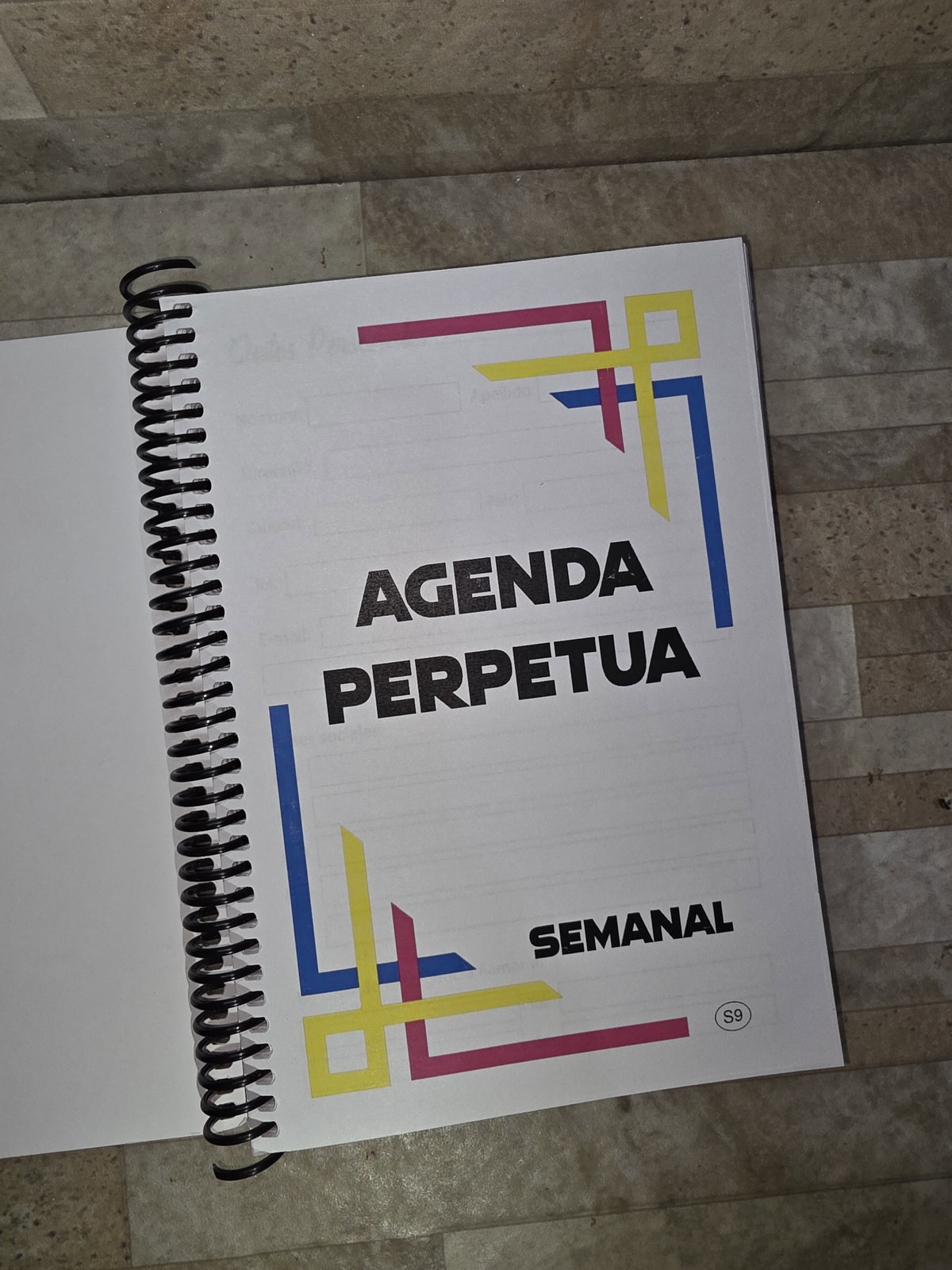 Secciones: Datos Personales, planificador anual, gastos, 2 días por hoja con horario de 8 a 22hs, notas