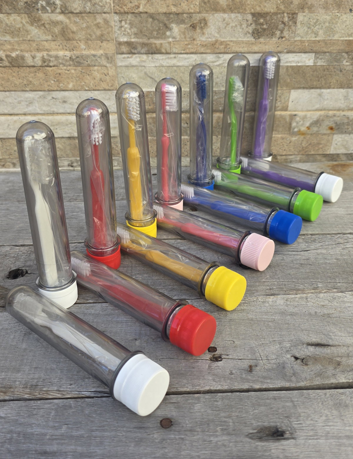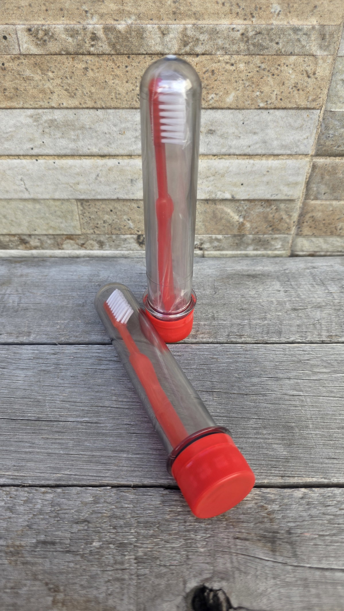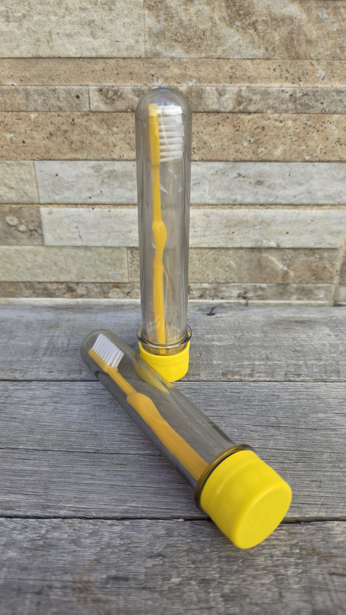 Tubo de acrílico plástico con cepillo de dientes y envoltura individual.