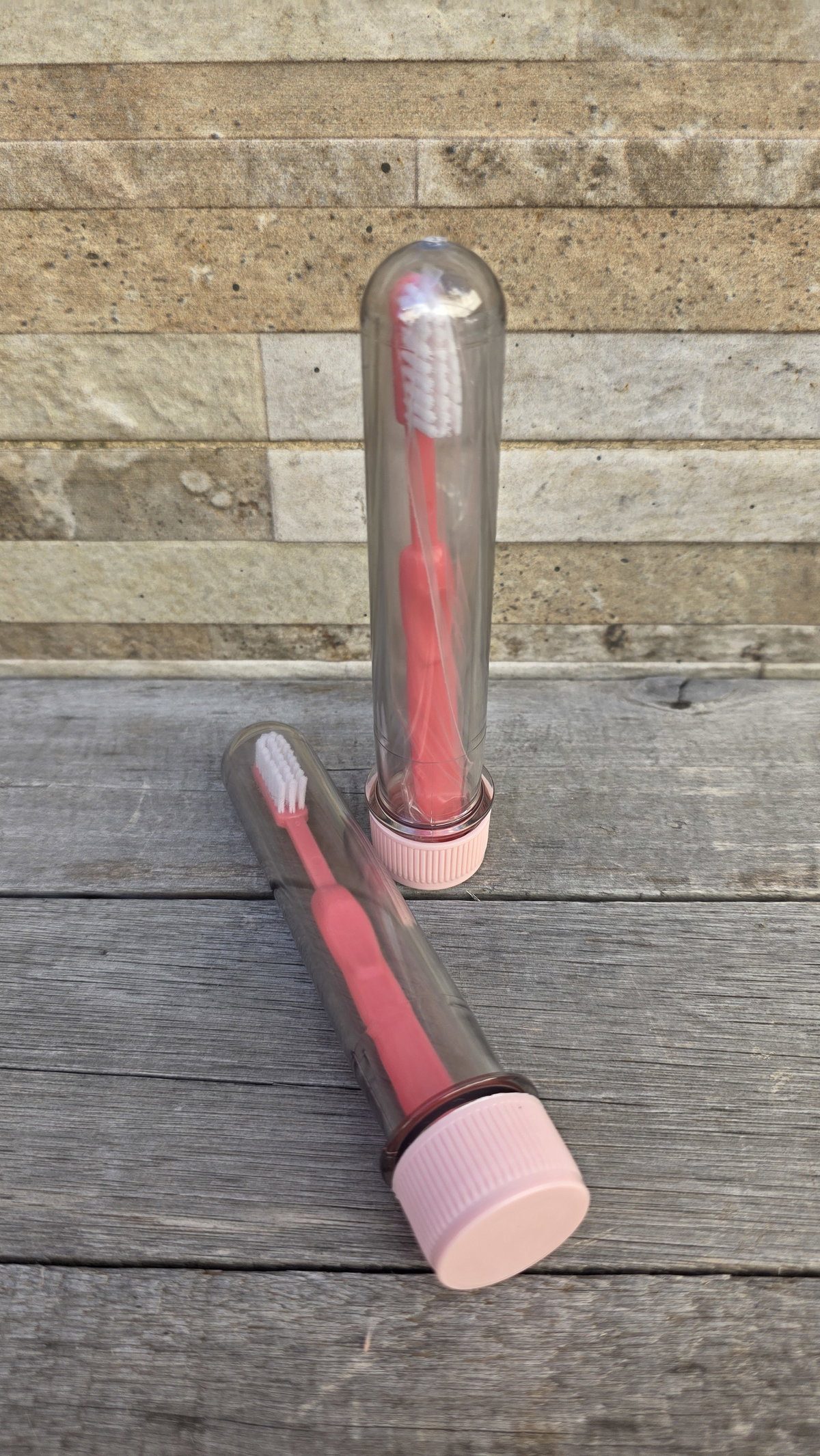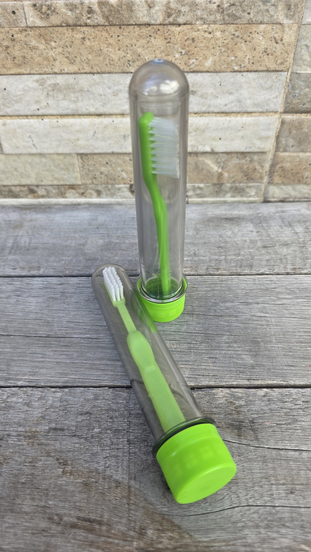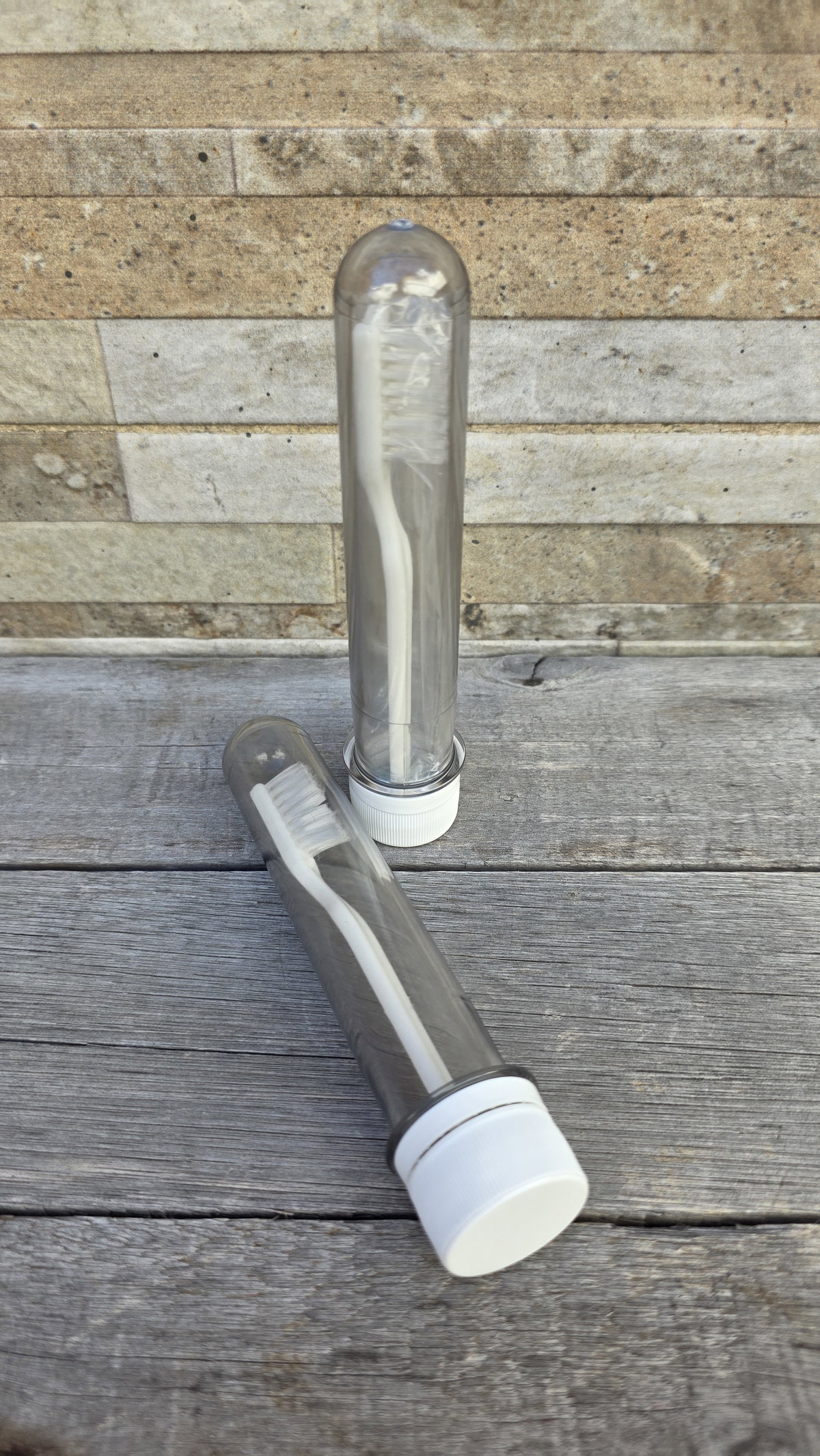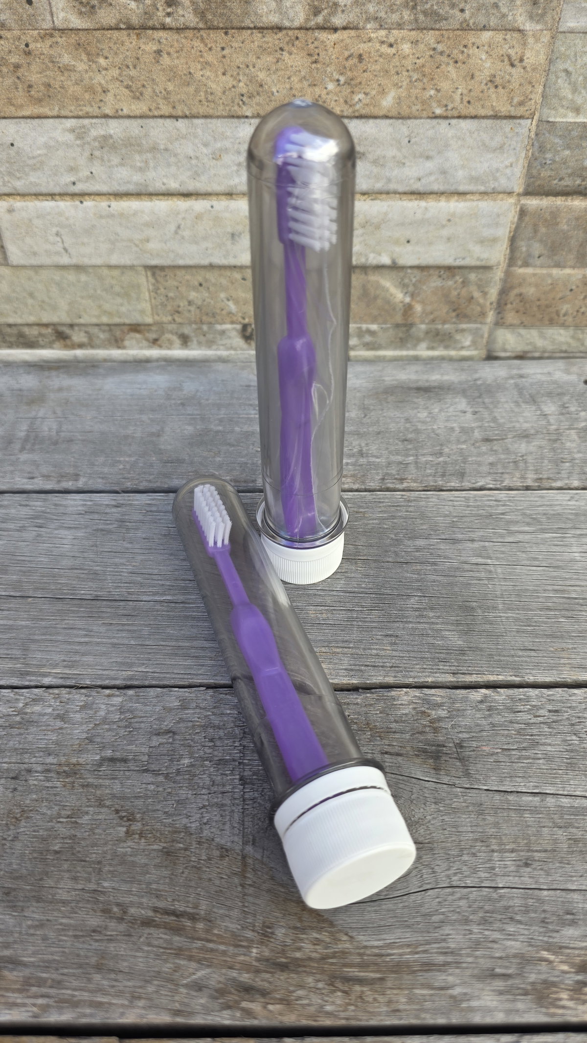Tubo de acrílico plástico con cepillo de dientes y envoltura individual.