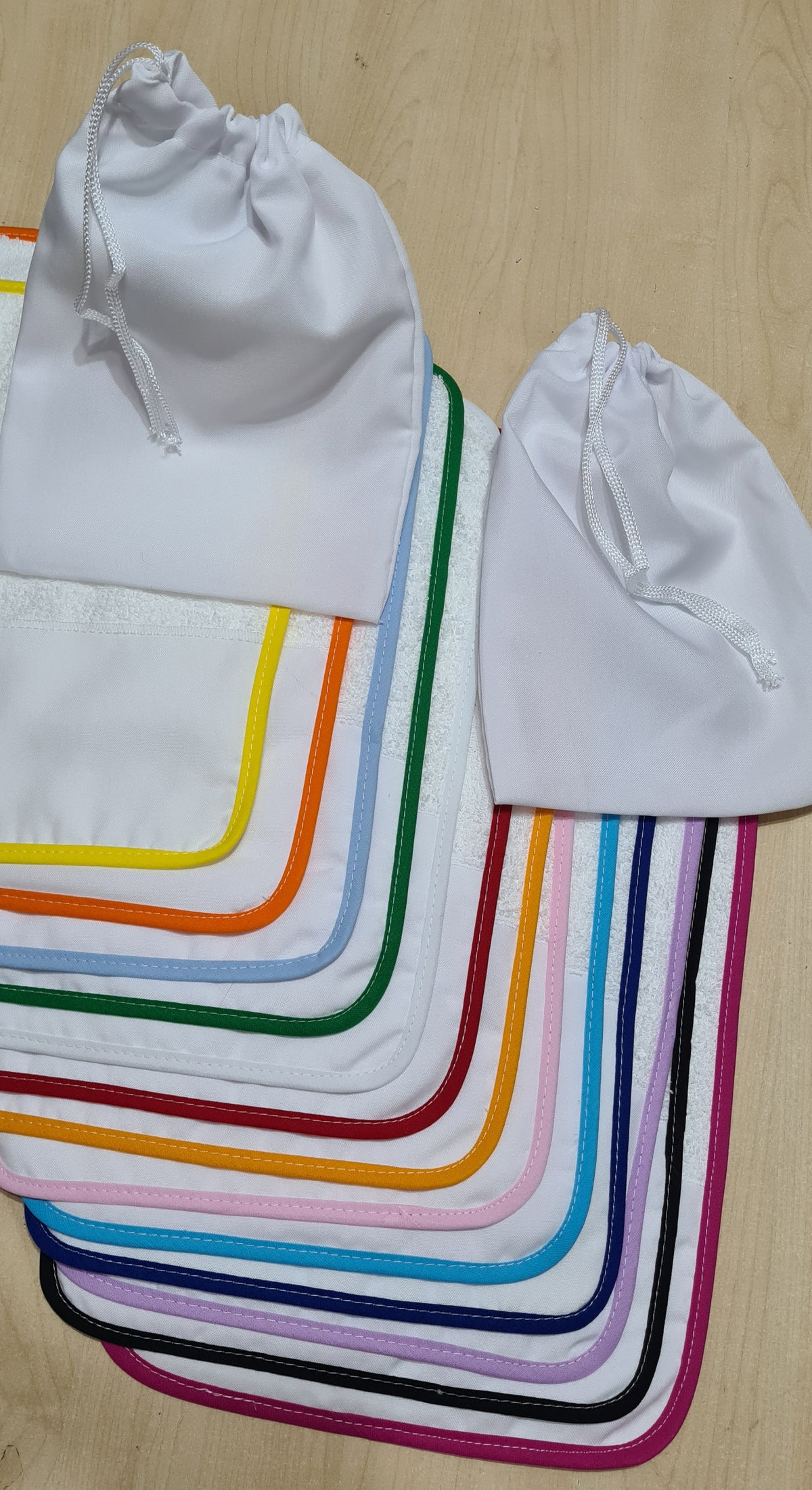 La toalla es de algodón super suave, con bordes al bies y contiene un aplique en tropical mecánico para sublimarla